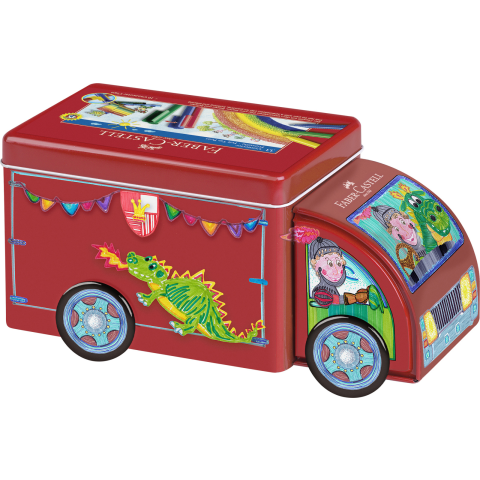 Ez a 33 darabos Faber-Castell filctoll készlet nemcsak a színek világába repíti a gyerekeket, hanem játékos formájával is rabul ejti őket. A különleges, piros színű fém teherautó nemcsak praktikus tárolódoboz, hanem izgalmas játékelem is – így a kreativitás és a játék öröme egyszerre jelenik meg a gyerekszobában. A vidám, mesés díszítésű jármű e