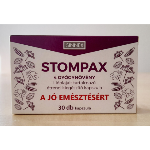 Stompax kapszula 30 db Stompax 4 GYÓGYNÖVÉNY illóolajait tartalmazó étrendkiegészítő kapszula Összetevők:szorbit,hipromellóz(Hidroxipropil-metil-cellulóz),magnézium-sztearát,édeskömény olaj(Aetheroleum foeniculi), kömény olaj(Aetheroleum carvi), menta
