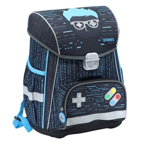 Iskolatáska STREET anatómiai ABC Gamester mérete: 32x38x25 cm, tömege 0,95 kg, űrtartalma 30,4 liter, anyaga 600D polyester; műanyag záras fényvisszaverő csat a könnyű egykerezs nyitáshoz; nagyon könnyű mindössze 950 gramm; ergonómiailag tervezett, pár