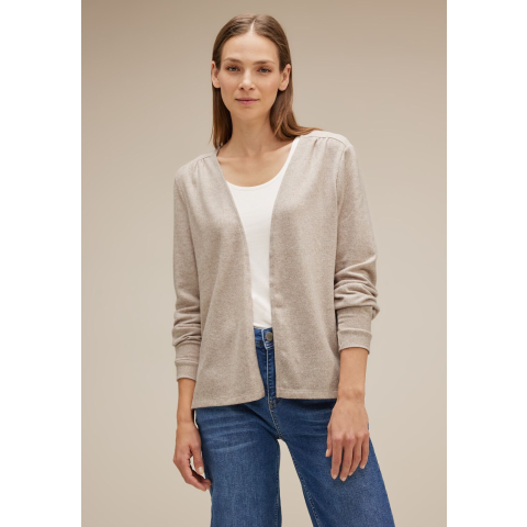 Street One Női Póló 320564-15379. Színe: spring sand melange Art. Cikkszám: A32056415379Finom elegancia finom kötésben! A Street One női ingkabát Jacy stílusban finom finom kötött anyagból készült, és diszkrét részletekkel nyűgöz le. A vállnál lévő enyhe gyűrődés különlegessé teszi, a nyitott kialakítás pedig sokféleképpen kombinálható. Akár blúzok, ingek vagy ruhák fölött viseli, ez a kardigán stílusos befejezés