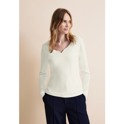 Street One Női Póló 320888-10108. Színe: off white Art. Cikkszám: A32088810108Ez a női ing a Street One-tól édes szív dekoltázzsal és kétrétegű, átlátszatlan előlappal tűnik ki. Sokoldalúan kombinálható darab, amely önmagában vagy alsóneműként is viselhető. Bájos, édeskés nyakkivágásával romantikus jelleget kölcsönöz megjelenésednek. 320888-10108