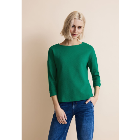 Street One Női Póló 320889-15376. Színe: fresh spring green Art. Cikkszám: A32088915376Ez az egyszínű női ing a Street One-tól 3/4-es ujjakkal, csónaknyakkivágással és texturált mintával rendelkezik. Pamutból készült, széles mandzsettával, viselhető önálló ingként vagy alatta. Sokoldalú stíluslehetőséget kínál, és rendkívül kényelmes viselet. 320889-15376