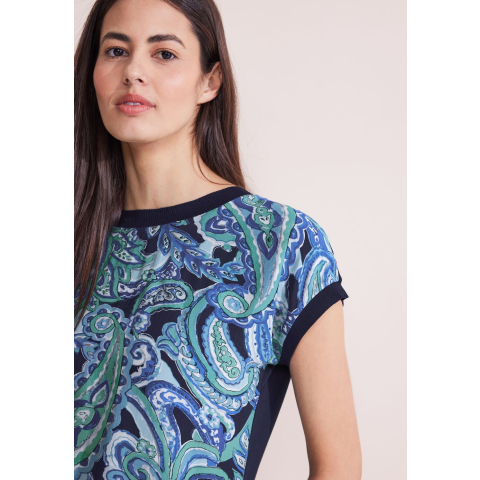 Street One Női Póló 321159-35681. Színe: intense aqua Art. Cikkszám: A32115935681Ez a Street One női póló bordázott részletekkel egy divatos, mintás felső, amely különleges színt kölcsönöz megjelenésednek. A puha krepp anyagból készült elülső rész és a kényelmes jersey hátrész nemcsak kényelmes viselet, hanem érdekes anyagkeveréket is kínál. Válaszd ezt az inget, és varázsolj változatosságot a ruhatáradba! 321159-3
