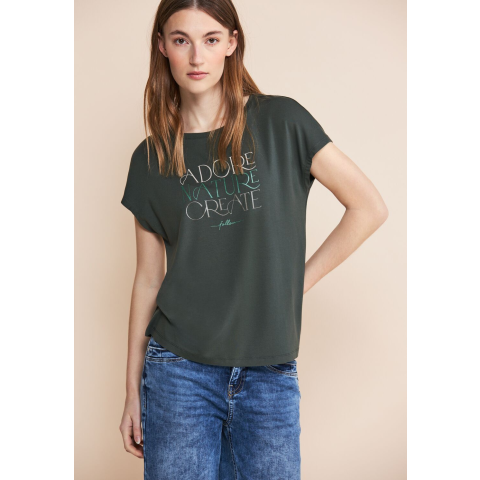 Street One Női Póló 321164-35518. Színe: marshy green Art. Cikkszám: A32116435518Ez a Street One női feliratos póló egy divatos, ejtett ujjú felső, amely az elején található többszínű felirattal különleges színt kölcsönöz megjelenésednek. A kerek nyakkivágás és a hátsó varrás kifinomult részleteket ad, míg a sztreccsel ellátott puha viszkóz kényelmes viseletet biztosít. Válaszd ezt a stílusos pólót, és mutasd meg sze