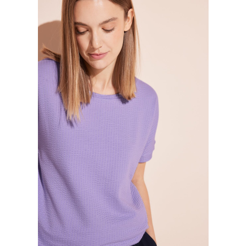 Street One Női Póló 321372-15384. Színe: smell of lavender Art. Cikkszám: A32137215384A Street One texturált női póló a divatos csónaknyakkivágást és a tökéletes illeszkedést biztosító elasztikus derékpántot ötvözi. A csíkos textúra különleges megjelenést kölcsönöz a pólónak. Kiváló minőségű, sztreccsel ellátott pamut keverékből készült. Sokoldalú, fél ujjú póló, amely a mindennapi viselethez és különleges
