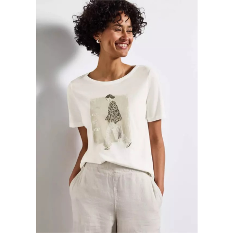 Termék leírás: Street One női póló - Környakú, fehér színű, grafikás mintával 323339-30108. Színe: fehér A Street One női pólója ideális választás hétköznapi viselethez. Kényelmes anyaga és divatos grafikus mintája kiválóan kombinálható farmerrel vagy casual nadrággal. Fehér színe miatt könnyen összeillik más ruhadarabokkal.Vásárolja meg a Street One női pólóját, amely nemcsak kényelmes, de stílusos is! Kiemelkedik grafikus mintázatával és sokoldal