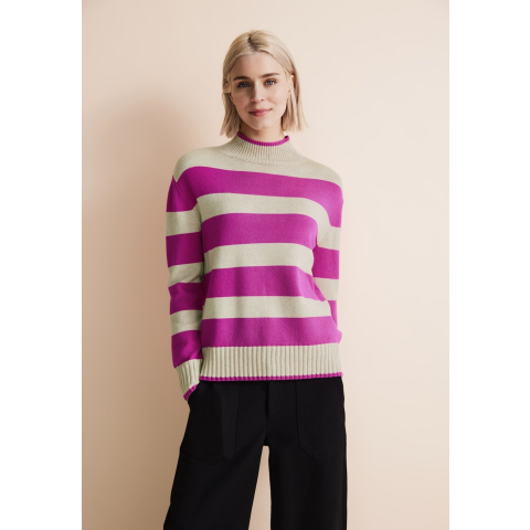 Street One Női Pulóver 302633-25462. Színe: purple cozy pink Art. Cikkszám: A30263325462Időtlen és elegáns! Ez a női kötött pulóver a Street One-tól állógallérral, kéttónusú csíkos mintával és bordás kötött elemekkel rendelkezik. Ez a puha női pulóver egy időtlen klasszikus modern értelmezése, és tökéletes a sokoldalú megjelenéshez. 302633-25462
