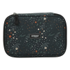 Belül textillel bevont merev lapokkal, gumis kialakítással az írószerek tárolásához, és egy cipzáras belső zsebbel.