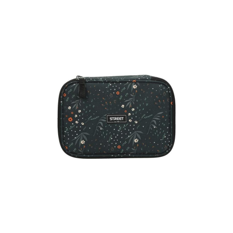 Belül textillel bevont merev lapokkal, gumis kialakítással az írószerek tárolásához, és egy cipzáras belső zsebbel.