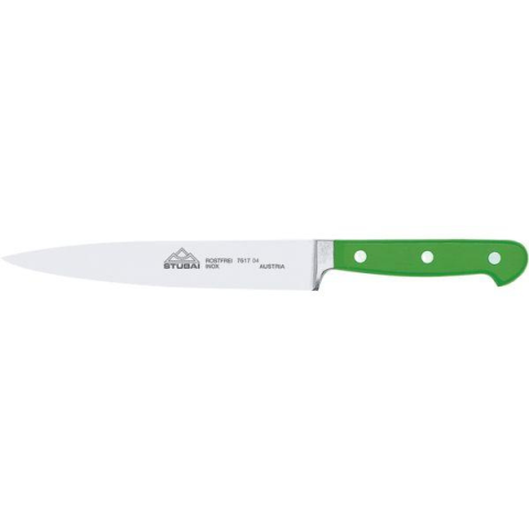 Stubai kovácsolt konyhakés zöld markolattal és 21 cm hosszú keskeny pengével. Króm-molibdén rozsdamentes acélból készült, ideális mindennapi konyhai használatra.