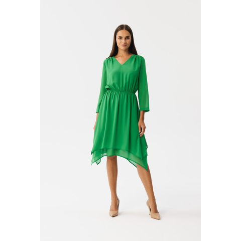 Alkalmi Ruha Stylove MM-185101. Színe: ZöldEz a gyönyörű ruha finom sifonból készült, ami könnyedséget és finomságot kölcsönöz neki. A ruhának aszimmetrikus réteges szegélye van, ami eredetiséget és könnyedséget kölcsönöz. A V alakú nyakkivágás elegáns és klasszikus. A deréknál lévő gumiszalag kiemeli a derekat, miközben kényelmet biztosít. A 7/8 hosszú ujjak modern jelleget kölcsönöznek a ruhának. A ruha hossza a t