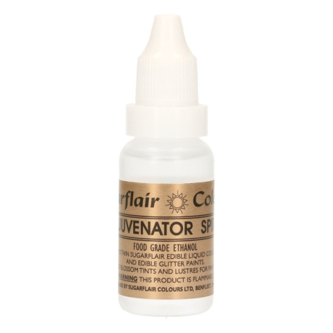 Sugarflair alkohol ételfestékekhez, 14 ml A Sugarflair Rejuvenator Spirit egy olyan alkoholfajta, amely alkalmas ehető termékekben történő használatra. Felhasználható tortákra szín vagy csillogó por festéséhez, de nagyon alkalmas finom cukorpasztavirág