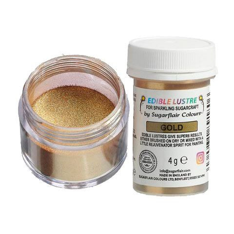 Sugarflair ehető lüszter ételfesték, arany, 4g A Sugarflair's ehető lüszter arany egy prémium minőségű, sokoldalú és biztonságos termék, amely gyönyörű fényt kölcsönöz az alkotásoknak. Tökéletes kiegészítője, hogy megadja alkotásainak azt a plusz simít