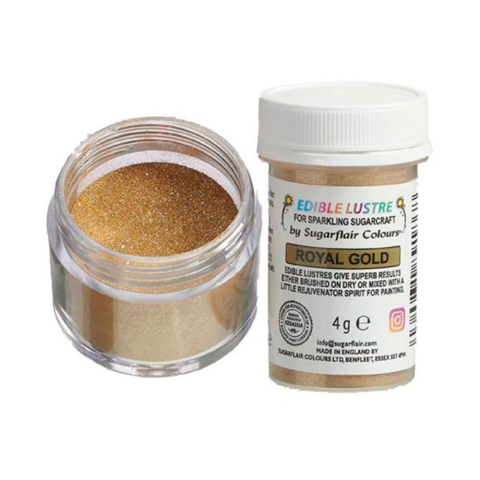 Sugarflair ehető lüszter por, királyi arany, 4g A Sugarflair ehető lüszter por királyi arany színű ételfesték egy prémium minőségű, sokoldalú és biztonságos termék, amely gyönyörű fényt kölcsönöz az alkotásoknak. Tökéletes kiegészítője, hogy megadja al