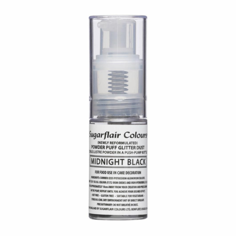 Sugarflair pumpás glitter spray, éjfekete, 10g Adjon alkotásainak gyönyörű befejező simítást ezzel a Sugarflair ehető csillámporral, amely egy nyomópumpás üvegben van. A spray könnyen használható, és nagyszerű dekorációkhoz, cupcake-ekhez, tortákhoz és