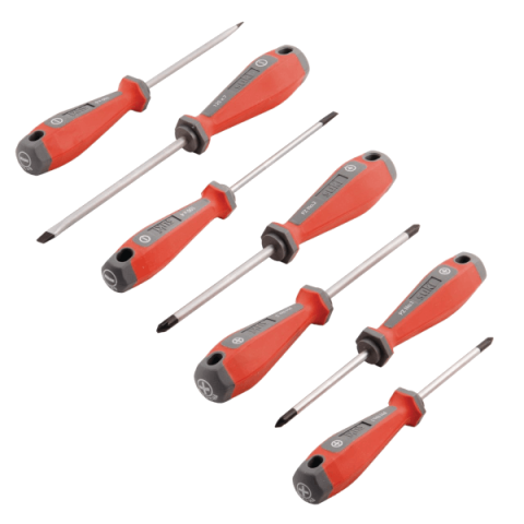 Csavarhúzó készlet SL, PH és PZ fejű csavarok meghúzására és lazítására. Megfelel az ISO 2380 és ISO 8764 szabványoknak. Anyaga: Króm