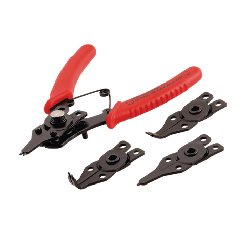Seegergyűrűk tengelyekre vagy furatokba rögzítéséhez használható. Szénacél, műanyag markolat, rugóval, 4 cserélhető fej, külső és belső gyűrűk számára, egyenesek és hajlítottak, 10