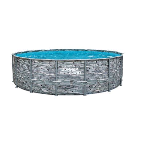 Summer Waves® Fémlábas 4,88 méteres átmérőjű és 1,22cm magas kerek, terméskő mintázatú mintázatú medence, belül kék mozaik mintával, vízforgatóval, létrával és medence aljtakaróval, fedővel és takarító készlettel együtt a csomagban