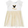 Arany hímzéssel, ujjain fodrokkal díszített, hátul nyakánál gombos, mell részen plüss, bájos tüllruha. Címke szerint 96 cm / 36 hónapos méret.