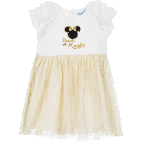 Arany hímzéssel, ujjain fodrokkal díszített, hátul nyakánál gombos, mell részen plüss, bájos tüllruha. Címke szerint 96 cm / 36 hónapos méret.