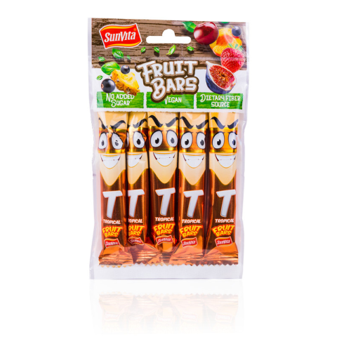 Sunvita fruit bars trópusi 5 db 75 g Hozzáadott cukrot nem tartalmaz, jó élelmi rost forrást, vegán.