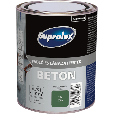 SUPRALUX BETON PADLÓ ÉS LÁBAZATFESTÉK 0,75L ZÖLD - Kül-és beltérre egyaránt ajánlott,különösen betonfelületekre,mert megvédi a vasbetont a korróziótól.Kerámia burkolólapokra alkalmas. Aszfaltra nem ajánlott - Sűrűség, g/liter: 1140-1200 színtől függően - Hígítás: Supralux Szintetikus Hígító max 10-15% az első rétegnél, második réteg: hígítást nem igényel. - Kiadósság: 7-9 m2/l egy rétegben - Száradási idő: 20°C-on max. 6 óra, Átfesthető: 24