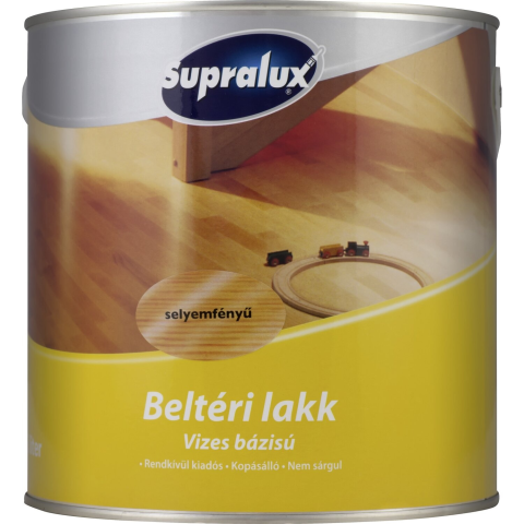A Supralux beltéri lakk egy vízzel hígítható, egykomponensű, környezetkímélő lakk parketta, hajópadló, lépcső, kezeletlen parafa és egyéb beltéri falfelületek bevonására. Megőrzi a fa természetes színét. Normál és erős igénybevételnek kitett felületekre. Kopásálló, a háztartásban előforduló vegyi anyagoknak ellenálló felületet ad.