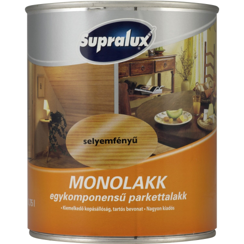 A Supralux Monolakk korszerű, poliuretán-alkid alapú, egykomponensű parkettalakk. Beltéri fa, parafa padlók védelmére alkalmazható. Tartós, kopásnak ellenálló réteget képez.