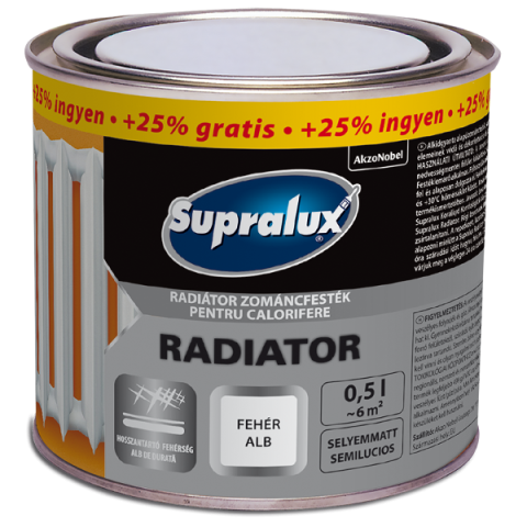 SUPRALUX radiátor SM fémfesték  - Alkyd gyantás, jó hőálló képességű, oldószer alapú festék radiátorokra és fűtőtestekre. Kiválóan tapad a fémhez, kiemelkedően jó korróziógátló hatású és hosszantartó fehérséget biztosít. Kiadósság: 11m2/l. Száradái idő: 12óra.