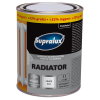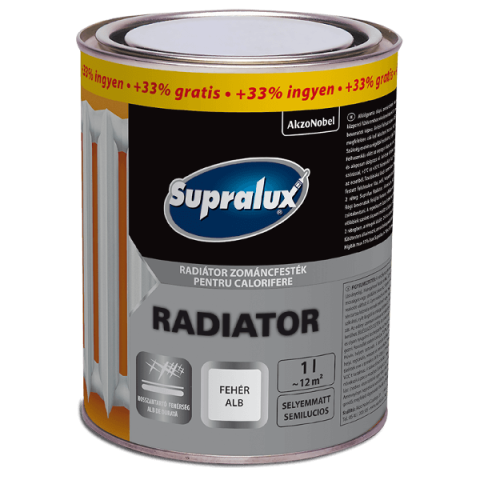 SUPRALUX radiátor SM fémfesték - Alkyd gyantás, jó hőálló képességű, oldószer alapú festék radiátorokra és fűtőtestekre. Kiválóan tapad a fémhez, kiemelkedően jó korróziógátló hatású és hosszantartó fehérséget biztosít. Kiadósság: 11m2/l. Száradái idő: 12óra.
