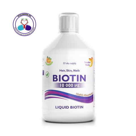 A Swedish Nutra Biotin 500 ml-es ital 10 000 µg B7 vitamint és C-vitamint tartalmaz. A biotin, azaz B7 vitamin, más néven H-vitamin a szervezetben termelődő, vízben oldódó B-vitamin fajta, mely belülről javítja a bőr textúráját, továbbá a haj és körmök egészségét. A B7-vitamin kulcsfontosságú szerepet játszik a szénhidrát-, zsír-, és fehérje-anyagcserében, ezenkívül az idegrendszer megfelelő működéséhez is hozzájárul. &nbs