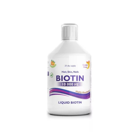 A biotin, azaz B7 vitamin, más néven H-vitamin fontos szerepet játszik a haj, bőr és a köröm egészségében. Továbbá nélkülözhetetlen a szénhidrát-, zsír-, és fehérje-anyagcseréhez. A Swedish Nutra Biotin 500 ml-es ital 10 000 µg B7 vitamint és C-vitamin