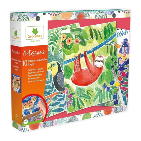 Sycomore Artissimo Akvarell kép készítés dzsungel csomag 10 megfesthető állattal és háttérrel. Akvarell festékek 6 intenzív színben: piros, narancs, sárága, világos zöld, kék, és indigó Útmutató a csomagban