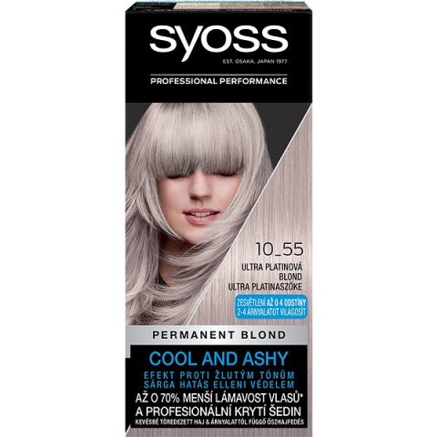 Hajvilágosító - tartós hatás Jéghideg árnyalatot ad a hajadnak sárgás tónusok elleni hatássalés akár 4 árnyalattal világosabbá teszi a hajad.A SYOSS Color 10-55 Ultra platinaszőke hajszőkítő főbb tulajdonságaiAkár 4 árnyalattal v