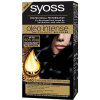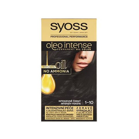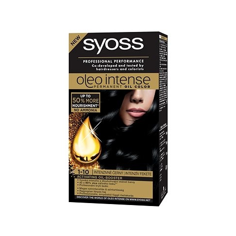 Hajfesték - fekete árnyalat, tartós típus, gél állag, ammóniamentes, teljes fedést biztosító és lenövés/ősz hajszál elfedő hatás, normál hajra, kesztyű, hajápoló és használati útmutató a csomagban, 115 ml űrtartalom Az első tartós hajfesték a Syoss-tól. Formulája aktiváló olajboosterrel gazdagított, amely maximalizálja a festési eredményt, miközben ápolja a hajat. Ráadásul tökéletesen fedi az ősz hajat, és teljes