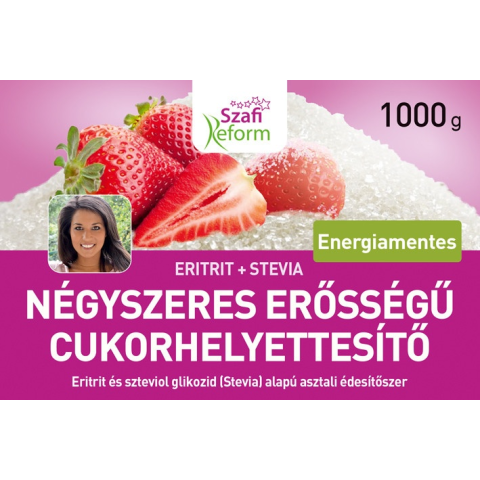 Szafi Reform Négyszeres erősségű cukorhelyettesítő 1000 g Eritrit és szteviol glikozid (stevia) alapú asztali édesítőszer. A Szafi Reform négyszeres erősségű cukorhelyettesítő egy energiamentes, 0 kcal kalóriatartalmú, eritrit és szteviol glikozid alapú