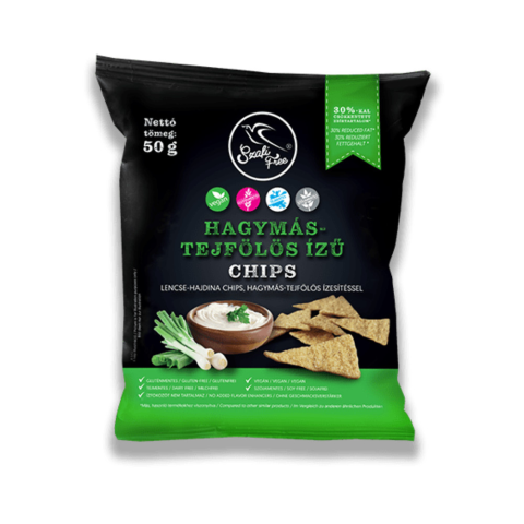 Szafi Free Hagymás-tejfölös ízű chips (gluténmentes) 50g Szafi Free hagymás-tejfölös ízű lencse-hajdina chips. Gluténmentes, tejmentes, szójamentes, vegán zöldségchips 30%- kal csökkentett zsírtartalommal*. Nem tartalmaz í