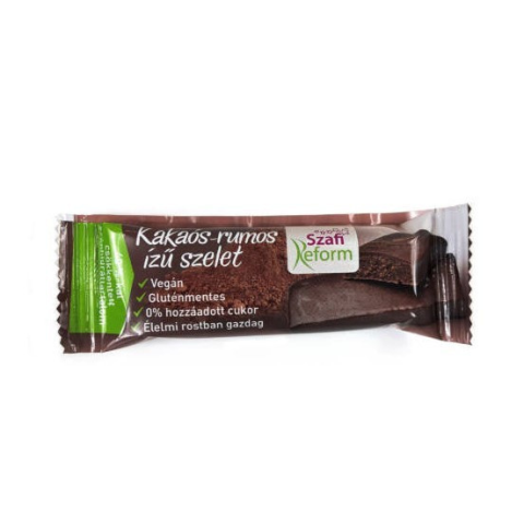 Szafi Reform kakaós-rumos ízű szelet 25 g Kakaós rumos ízű szelet étcsokoládéba (20%) mártva, édesítőszerekkel Hozzáadott cukrot nem tartalmaz. Természetes módon előforduló cukrokat tartalmaz. Vegán Gluténmentes Élelmi rostban gazdag 40 %-kal csö