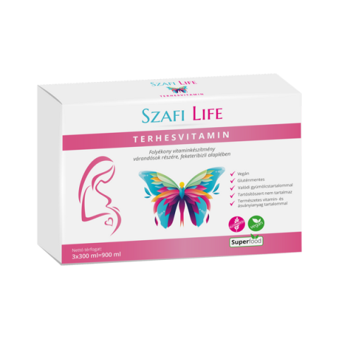 Szafi Life Terhesvitamin 3x300ml Folyékony vitaminkészítmény várandósok részére, feketeribizli alaplében Tartósítószert nem tartalmaz. Valódi gyümölcstartalommal, amely a természetes vitamin- és ásványianyag tartalmat is biztosítja
