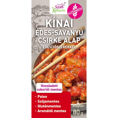 Szafi Reform Kínai édes-savanyú csirke alap (gluténmentes) 80 g Összetevők: Fűszerkeverék (só, paprika, vöröshagyma, gyömbér, kurkuma, koriander, görögszénamag, sárgarépa, mustármag, római kömény, cayennebors, petrezselyemlevél), tápiókakeményítő, édesítő