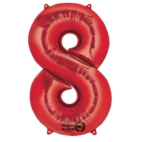 Színes Óriás 8-as szám Fólia Red fólia lufi Fólia léggömb, mely héliummal vagy levegővel tölthető. A lufi önzárószeleppel van ellátva, amely megakadályozza a gáz elszökését. Méret: 53*86 cm Anyaga: fólia A lufi tartó pálca + csésze külön megvásárolh