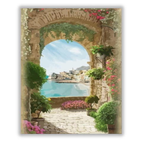 A kastélyban - számfestő készlet – 40×50 cm (Keret nélkül) Ez a festmény egy nyugodt mediterrán pillanatot varázsol elénk, ahol a természet és az építészet harmóniája dominál. Egy titokzatos történet bontakozik ki a kőkapu mögött, amely egy távoli kikötőv