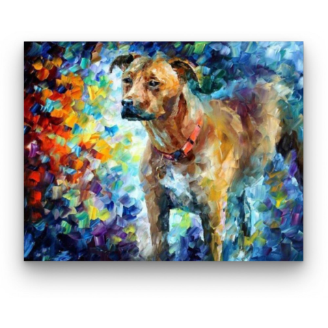 A Legjobb Barát - számfestő készlet – 40×50 cm (Keret nélkül) A festmény vibráló színei az életöröm érzését keltik a nézőben. Egy hűséges társ története bontakozik ki, ahogy tekintete a messzeségbe réved. A háttér színkavalkádja dinamikus energiát ad a ko