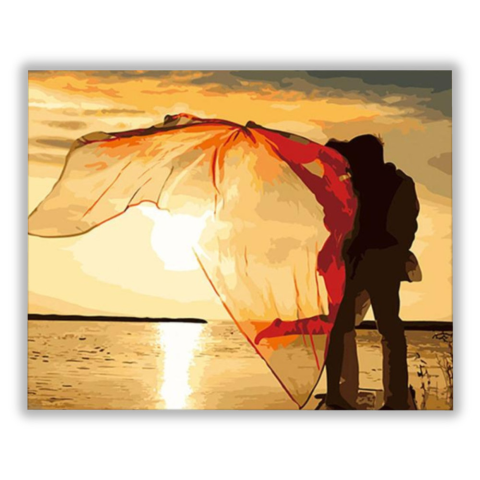 A piros sál mögött - számfestő készlet – 40×50 cm (Keret nélkül) Ez a festmény a naplemente varázslatos pillanatait idézi, ahol a szél játéka és a fények tánca elvarázsolja a nézőt. Egy történet bontakozik ki előttünk, amelyben az emberi alak és a lobogó