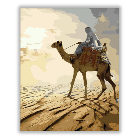 A sivatagban - számfestő készlet – 40×50 cm (Keret nélkül) A sivatagi naplemente csendes nyugalma öleli körbe a festményt, amely egy magányos utazó történetét meséli el. A homokdűnék aranyló színei és a háttérben derengő égbolt misztikus harmóniát teremte