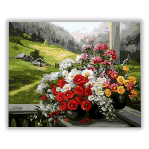 A vidék csodája - számfestő készlet – 40×50 cm (Keret nélkül) A festmény egy békés, idilli tájat idéz, ahol a természet szépsége magával ragadja a nézőt. A képen megjelenő színes virágok és a háttérben meghúzódó vidéki házikók történeteket mesélnek egy el