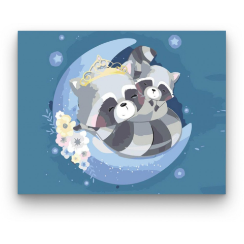 Alvó mosómedvék - számfestő készlet – 40×50 cm (Keret nélkül) Ez a festmény nyugalmat áraszt, ahogy a mosómedvék békésen szundítanak az éjszakai égbolt alatt. A kép egy mesebeli történetet sejtet, ahol a hold hintázik álmosan a csillagok között. A kék és