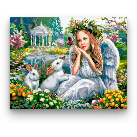 Angyal a kertben - számfestő készlet – 40×50 cm (Keret nélkül) A festmény varázslatos, békés hangulatot áraszt, amely azonnal magával ragadja a nézőt. Egy mesebeli jelenet bontakozik ki, ahol egy angyal és nyuszik találkoznak egy tavaszi kertben. A színek