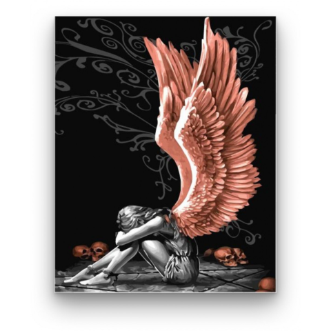 Angyali pihenés - számfestő készlet – 40×50 cm (Keret nélkül) Ez a festmény misztikus és melankolikus hangulatot áraszt, elgondolkodtatva a nézőt az angyali alak történetén. A szárnyak árnyékában rejtőző figura csendes magányt sugall, miközben a háttér sö