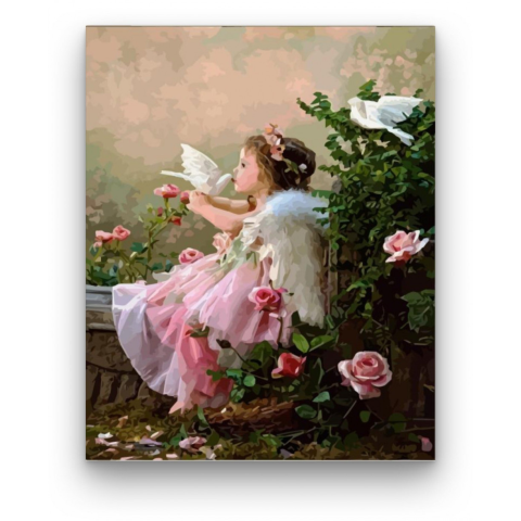 Angyalka galambokkal - számfestő készlet – 40×50 cm (Keret nélkül) Ez a festmény egy álomszerű világba repít, ahol a béke és a tisztaság uralkodik. Egy fiatal angyalka játékosan kommunikál galambokkal, mintha egy titkos mesét osztanának meg egymással. A l